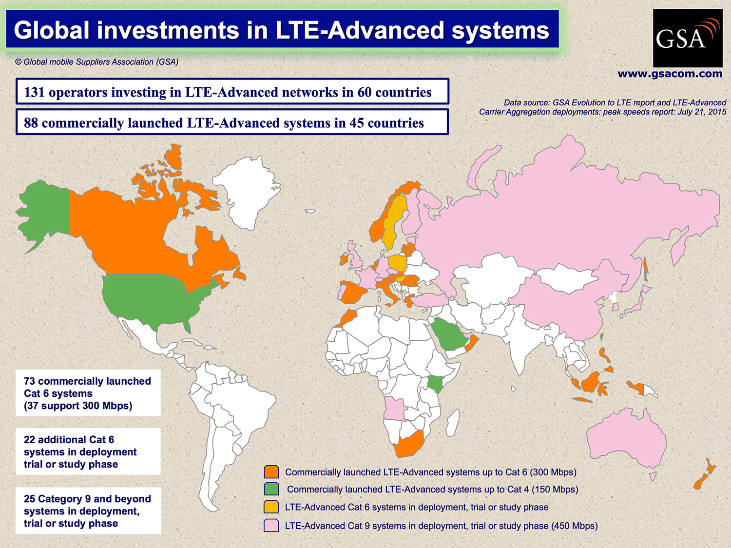 สีส้ม คือประเทศที่มี LTE-A ความเร็ว 300 Mbps