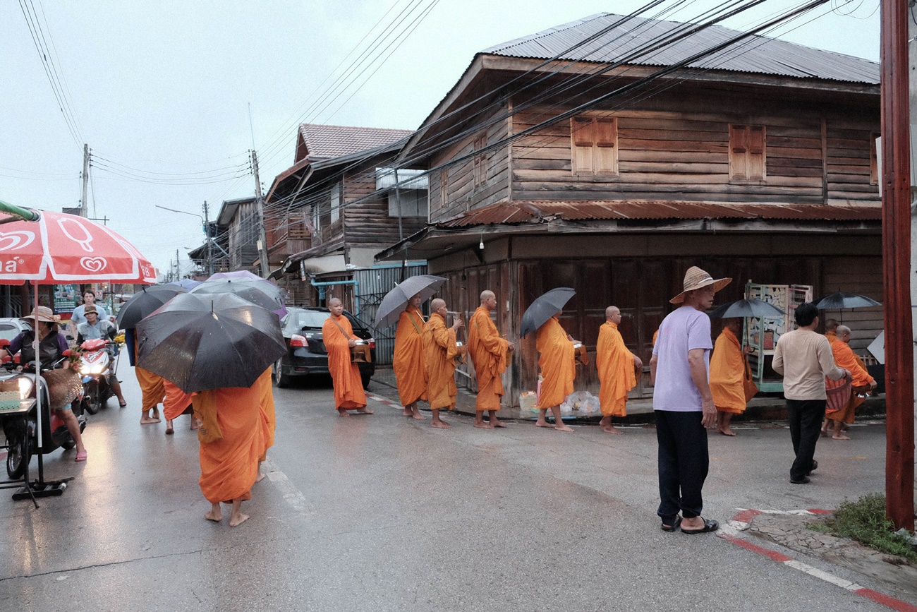 ตื่นเช้ามาพร้อมอากาศเย็นๆ ฝนตกปรอยๆ ล้างหน้าแปรงฟัน และออกไปตักบาตข้าวเหนี่ยว พระออกมาบิณฑบาตกันเยอะมาก