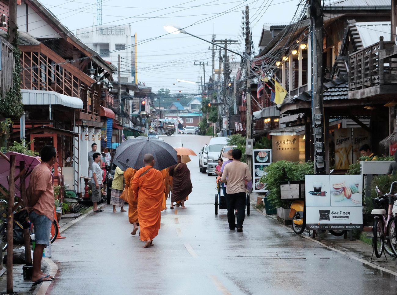 บ้านแทบทุกหลังจะเปิดบ้านรอนิมนต์พระให้นักท่องเที่ยวได้ใส่บาต ผมก็ดื่มด่ำกับบรรยากาศยามเช้าชิวๆ ไปครับ