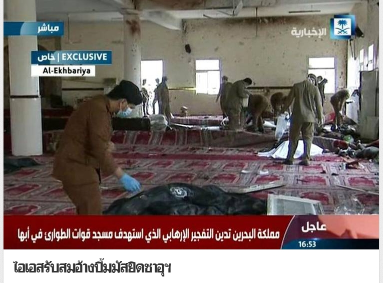 „สำนักข่าวต่างประเทศรายงานจากกรุงริยาดประเทศซาอุดีอาระเบียเมื่อวันที่ 7ส.ค.ว่ากระทรวงมหาดไทยของซาอุดีอาระเบียแถลงว่า คนร้ายมือระเบิดฆ่าตัวตายของกลุ่มหัวรุนแรงไอเอส ได้จุดชนวนระเบิดเป็นเสื้อกั๊กในระหว่างพิธีทางศาสนาภายในมัสยิดของกองบัญชาการหน่วยปฏิบัติการพิเศษที่เมืองอับฮา จังหวัดอาซีร์ทางตอนใต้ของซาอุดีอาระเบียใกล้กับพรมแดนของประเทศเยเมนเมื่อวันศุกร์ที่ผ่านมาแรงระเบิดทำให้มีผู้เสียชีวิต15ศพแยกเป็นสมาชิกหน่วยปฏิบัติการพิเศษ12คน และอีก 3คนเป็นคนงานภายในมัสยิดนอกจากนั้นก็ยังมีอีก 7คนได้รับบาดเจ็บ กลุ่มอัล-ฮิจัซโพรวินซ์เครือข่ายของไอเอสได้ออกแถลงการณ์ว่าอยู่เบื้องหลังการโจมตีดังกล่าวซึ่งนับเป็นเหตุโจมตีล่าสุดและสูญเสียมากที่สุดต่อกองกำลังฝ่ายความมั่นคงของรัฐบาลซาอุดีอาระเบียในช่วงหลายสัปดาห์ที่ผ่านมาส่วนอีกกลุ่มนัดจ์ โพรวินซ์เครือข่ายไอเอสเช่นกันได้อ้างความรับผิดชอบการโจมตีมัสยิดแห่งหนึ่งเมื่อเดือนพ.ค.ที่ผ่านมาคร่าชีวิตผู้คนไป 25ศพ“