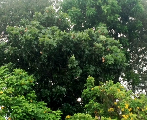 และก้อเหลือบไปเห็นลูก ดูไกลๆคล้ายละมุด แต่ไม่น่าใช่ละมุด สีออกน้ำตาล ติดเป็นช่อๆเลยบางต้น ถ่ายรูปไม่ทัน