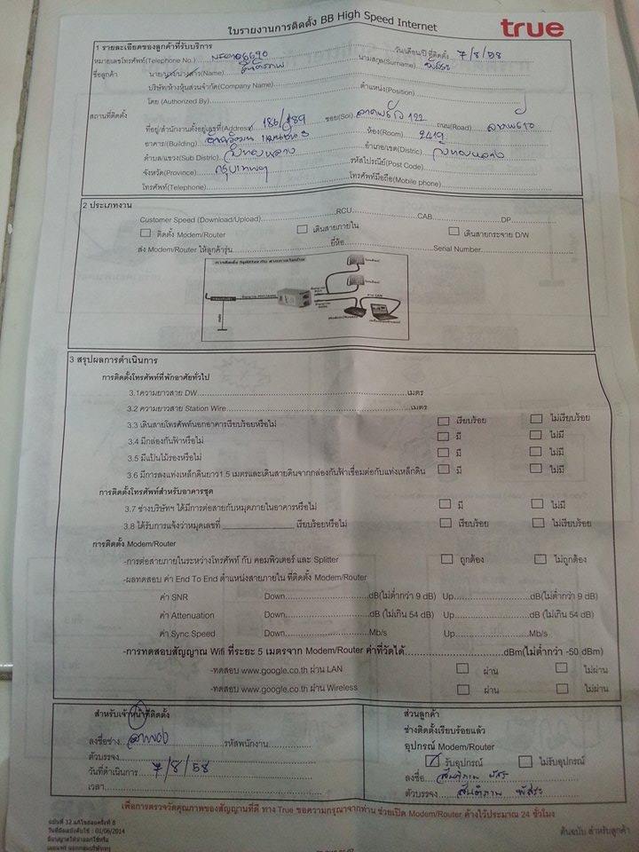 พอดีเมื่อวาน เพิ่งได้ติดตั้งอินเตอร์เน็ตของทรูค่ะ ติดที่อพาร์ทเมนท์ พอดีที่อพาร์ทเม้นท์เขามีการเดินสายให้แล้วทุกห้อง เหลือแต่มาเสียบสายติดตั้งเท่านั้นค่ะ ก่อนหน้านี้ที่โทรไปสอบถามก่อนติดตั้งทางทรูบอกว่า ไม่มีค่าใช้จ่ายใดๆทั้งสิ้น รอจ่ายค่าบริการปกติตามรอบบิลที่เขาจะส่งมาให้ตอนสิ้นเดือนเท่านั้นคือ 699 บาท แต่เมื่อวาน มีช่างมาติดตั้ง แล้วตอนที่ช่างต่อโมเดม เขาบอกว่า อินเตอร์เน็ตไม่เข้านี่นา... แล้วเขาก็เดินออกมาดูสายหน้าห้อง แล้วเราก็บอกว่าตู้ระบบอินเตอร์เน็ตของหอพักน่าจะอยู่ข้างล่าง ให้ลงไปถามที่ออฟฟิศ เราก็รอ ช่างลงไปประมาณ 3 นาที เขากลับขึ้นมา อินเตอร์เน็ตติด แล้วเขาก็เขียนใบเสร็จให้เรา ตอนช่างจะกลับเขาบอกว่า มีค่าบริการด้วยน่ะครับ 300 บาท เราก็ถามกลับไปว่า ค่าอะไรค่ะ เพราะเห็นก่อนหน้านี้โทรถามทางบริษัททรู บริษัทบอกว่า