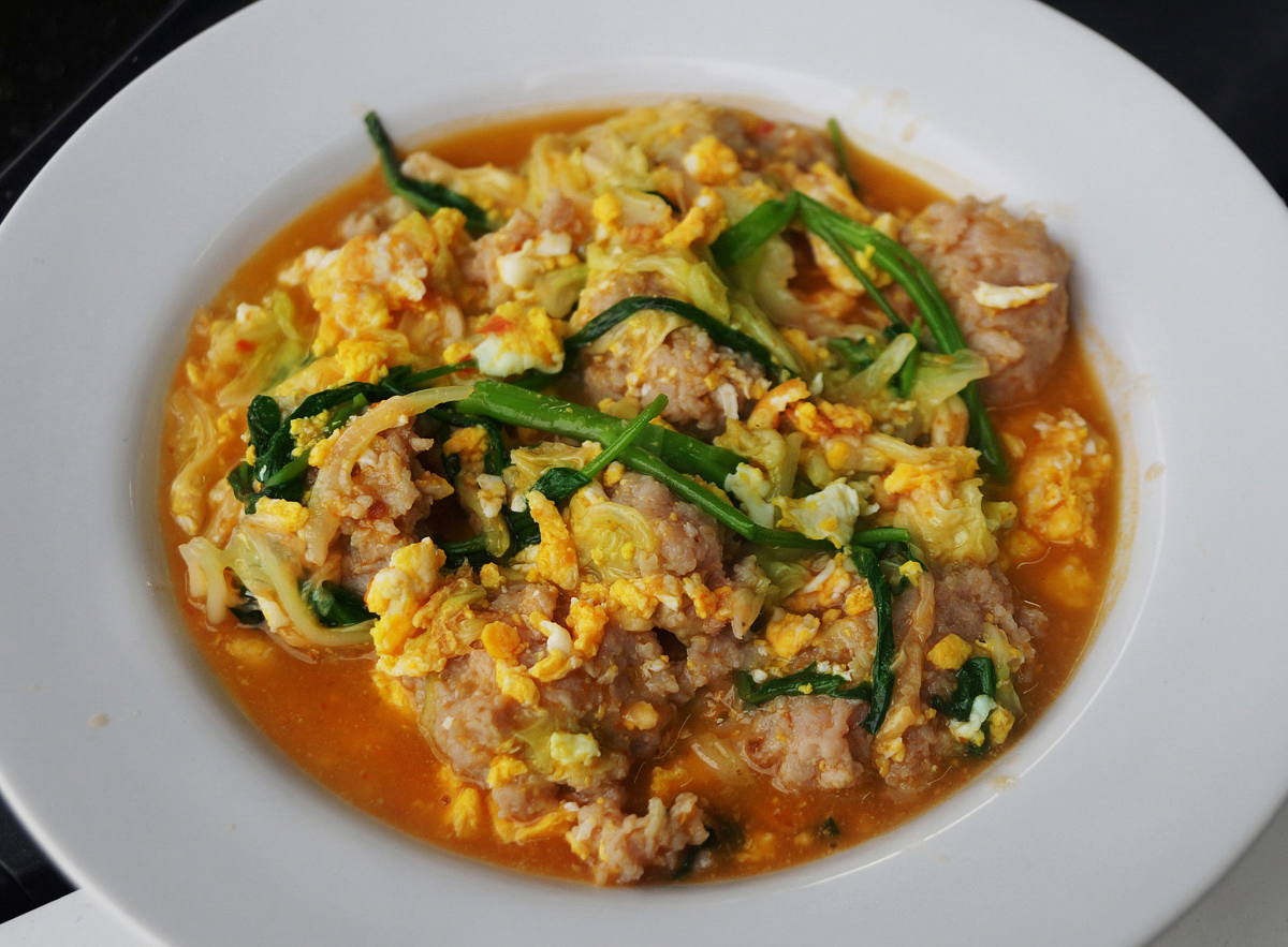 ทำกินเมื่อกี้ พอดีลูกน้องให้ไข่ไก่บ้านมาหลายฟอง เค้าเลี้ยงเอง บอกว่าไก่เลี้ยงปลอดสารเคมี เลยเอามาทำสุกี้แห้งครับ ให้เด็กไปซื้อหมูหมัก ดันได้หมูเด้ง - -"