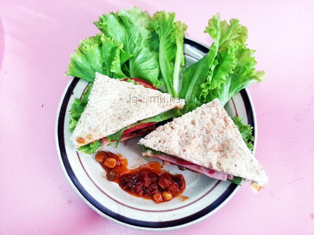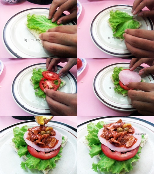 นำผักสลัดมาวางบนขนมปัง มะเขือเทศ แฮม ตามด้วยเสต๊กทูน่า แล้วก็ทำเหมือนเดิมปิดด้วยขนมปัง