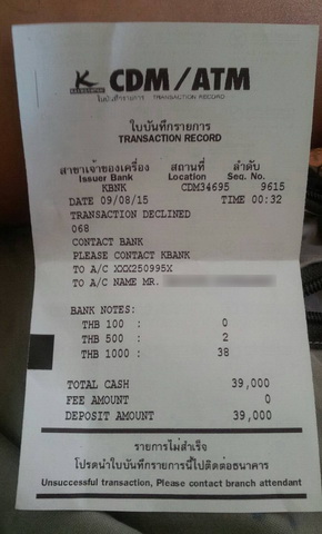 ตอนฝากก็ฝากเข้าปกติ ไม่มีเตือนอะไร พอฝากเสร็จก็จะทิ้งสลิปแทบทุกครั้ง แต่ครั้งนี้เอะใจยังไงไม่รู้ เลยเก็บไว้ แล้วผมมีสมัคร SMS ไว้ เตือนเงินเข้าออก คราวนี้ก็ไม่เตือนแฮะ คิดว่าระบบคงหลับอยู่ ช่างมัน จนมาวันนี้ก็มาเช็คยอดเงิน เงินไม่เข้าครับ เลยไปเอาสลิปมาดู ทําไมเป็นแบบนี้ว่ะ รายการไม่สําเร็จ แต่เงินเข้าตู้ไปแล้ว เลยโทรไป 02-888-8888 ถามว่าต้องทําไงบ้าง