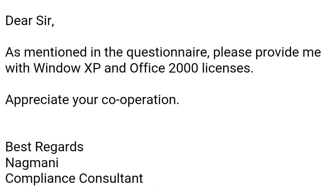 คือทาง Microsoft ส่งเมล์มาให้ทางบริษัทผม ให้ทำ Software Asset Management (SAM) คือจะแนบไฟล์ Excel มาให้กรอกว่าบริษัทเราใช้ software license อะไรจาก Microsoft บ้าง ซึ่งค่อนข้างจะถามละเอียดมาก และทางบริ