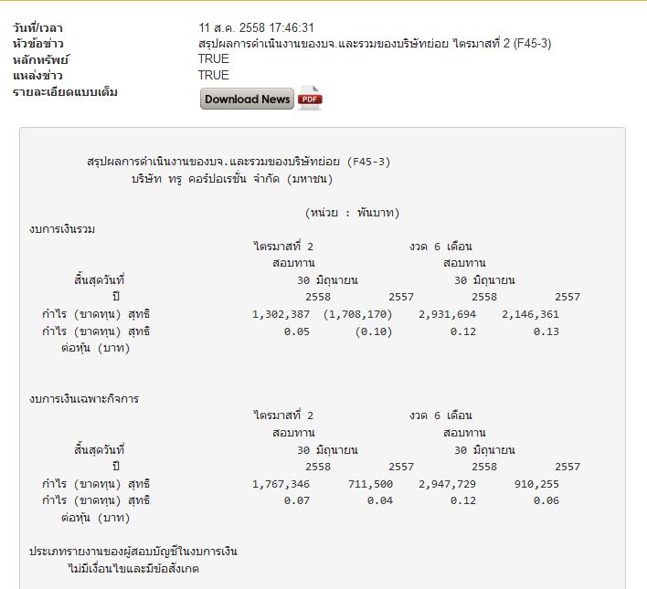 งบ True มาแล้วครับ ไตรมาส 2/58 กำไรหนึ่งพันสามร้อยล้านครับ