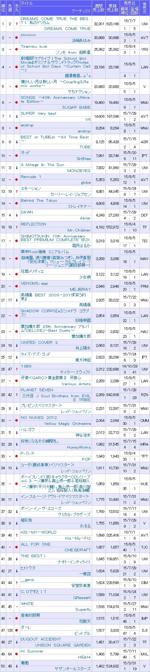 วง DREAMS COME TRUE กลับมาขึ้นมาสู่อันดับ 1 อีกครั้งในรอบ 2 สัปดาห์ กับอัลบั้ม "DREAM COME TRUE THE BEST! Watachi no Dorikamu" กับการขายในสัปดาห์ที่ 5 และกับอันดับ1 อัลบั้มประจำสัปดาห์รวมเป็น 4 สัปดาห์
