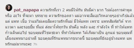 ขอบคุณที่โชคชะตา ที่ทำให้แพท ได้เกิดมาเป็นลูกแม่ ขอบคุณที่เลี้ยงแพทมาอย่างดี ขอบคุณที่รักแพทมากขนาดนี้ ขอบคุณที่ยังอยู่ข้างแพท แพทรักแม่มากนะคะ"