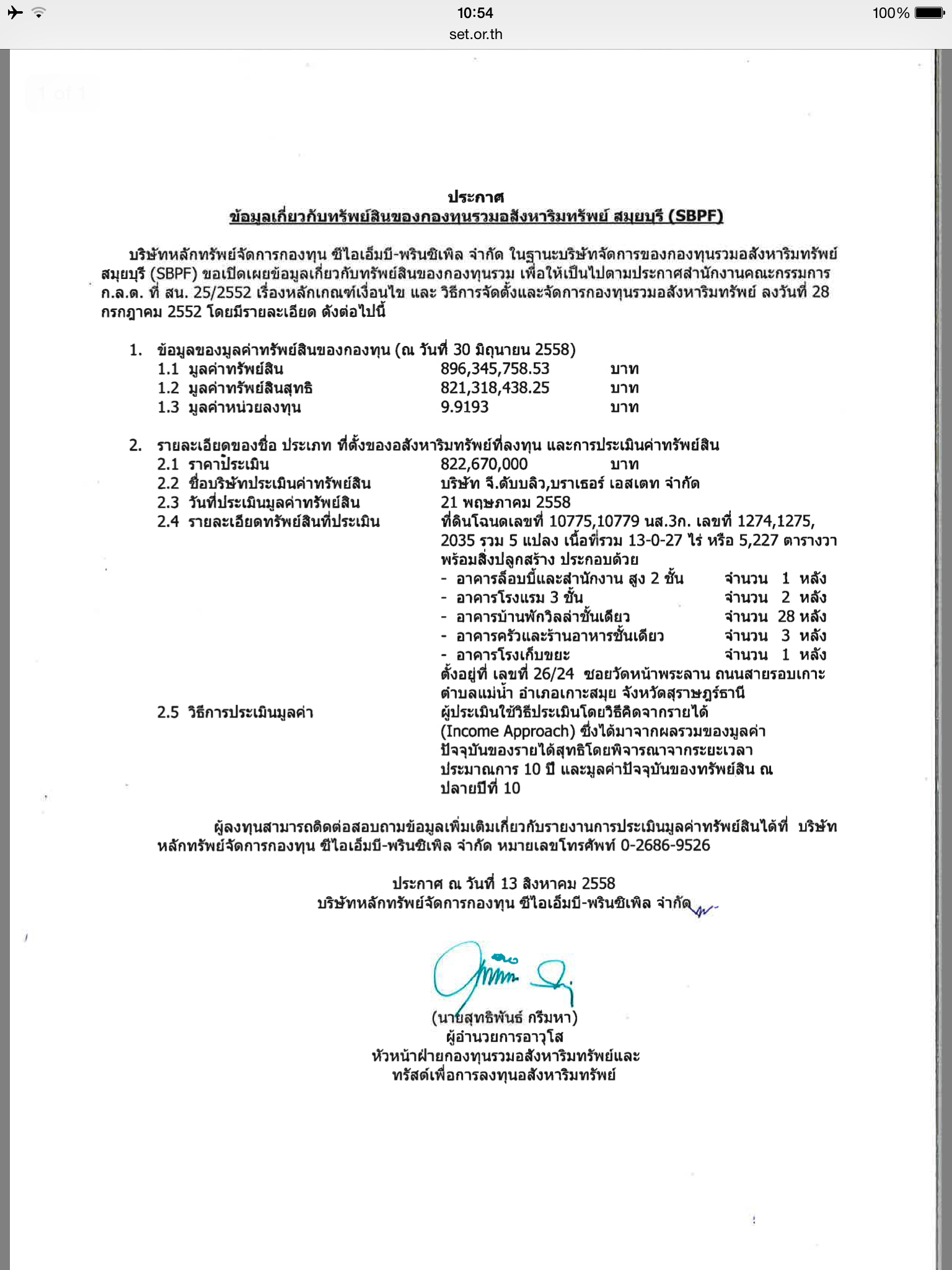 SBPF : มูลค่าหน่วยลงทุนล่าสุด 13.08.2558