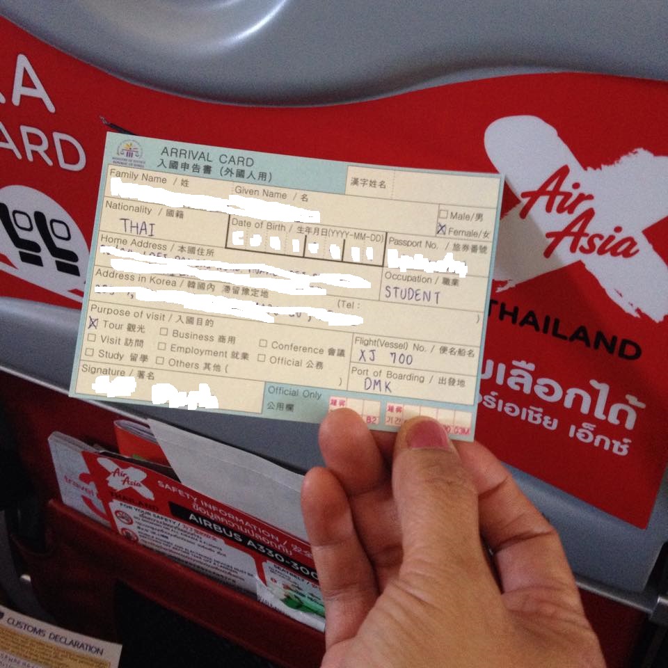 พอเครื่อง Take off สักพักแอร์ก็จะแจกใบผ่านตมใและใบผ่านศุลกากรให้เราค่ะ แนะนำว่าให้เขียนตั้งแต่บนเครื่องค่ะเพราะถ้ารอมาเขียนที่เคาน์เตอร์คนจะเยอะมากๆ ที่เก็บของหน้าที่นั่งจะมีหนังสือคู่มือการเขียนอยู่ค่ะไม่ต้องกังวล แต่ถ้าใครจะอยากเตรียมตัวก่อนก็นี่เลยค่ะวิธีเขียน ( http://seoulcafe2013.blogspot.com/2013/06/blog-post_27.html )