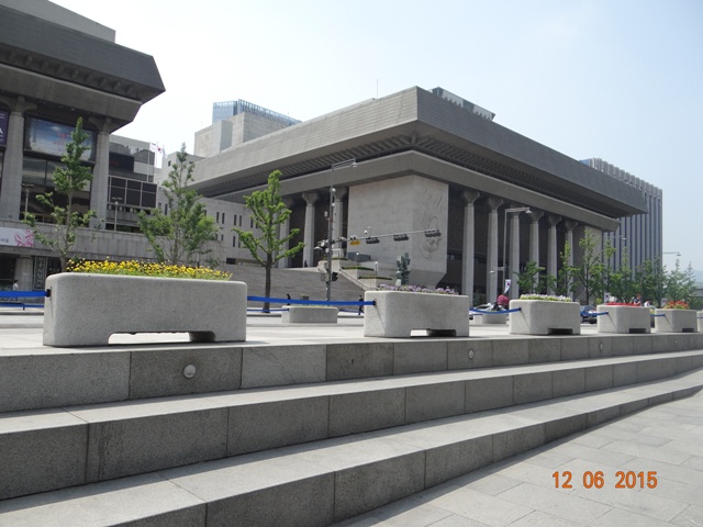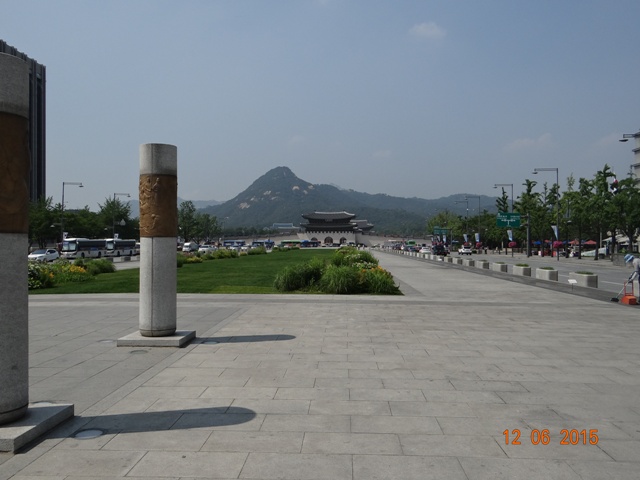 พอมองออกไปข้างหน้าจะพบกับกษัตริย์เซจงและด้านหลังก็คือ ประตูกวังฮวามุน (Gwanghwamun Gate) ของพระราชวังคยองบกค่า ด้านซ้ายมือจะเป็นโรงละครเซจงที่รันนิ่งแมนเคยมาถ่ายทำตอนแรกๆค่ะสาวกรันนิ่งแมนต้องจำได้ ที่หาตัวแฮชิที่ซ่อนอยู่ตอนนี้ยงฮวามาค่ะ สนุกมากกกก