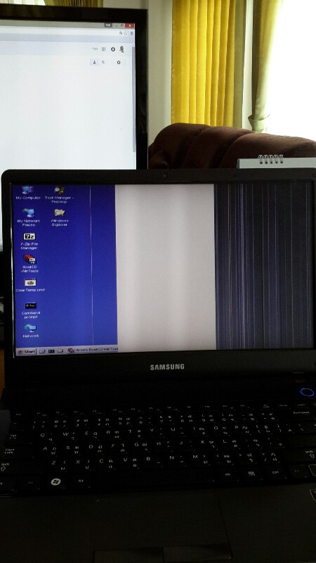 สวัสดีค่ะ โน้ตบุ๊คซัมซุงแต่ไม่แน่ใจว่ารุ่นอะไร Window7 ตอนนี้จอเสียได้ยินเสียงชัดระบบเหมือนเดิม แต่จอเป็นประมาณนี้ ถ้าจะซ่อมต้องเสียเท่าไหร่คะ🥲