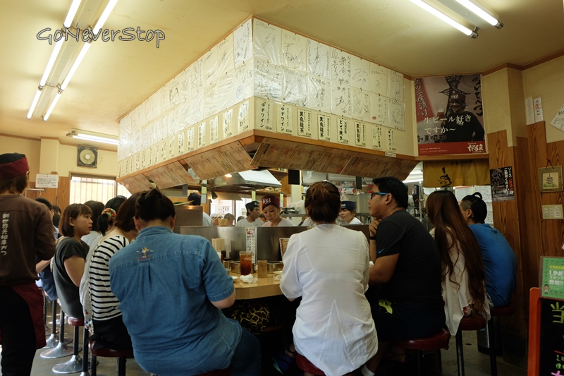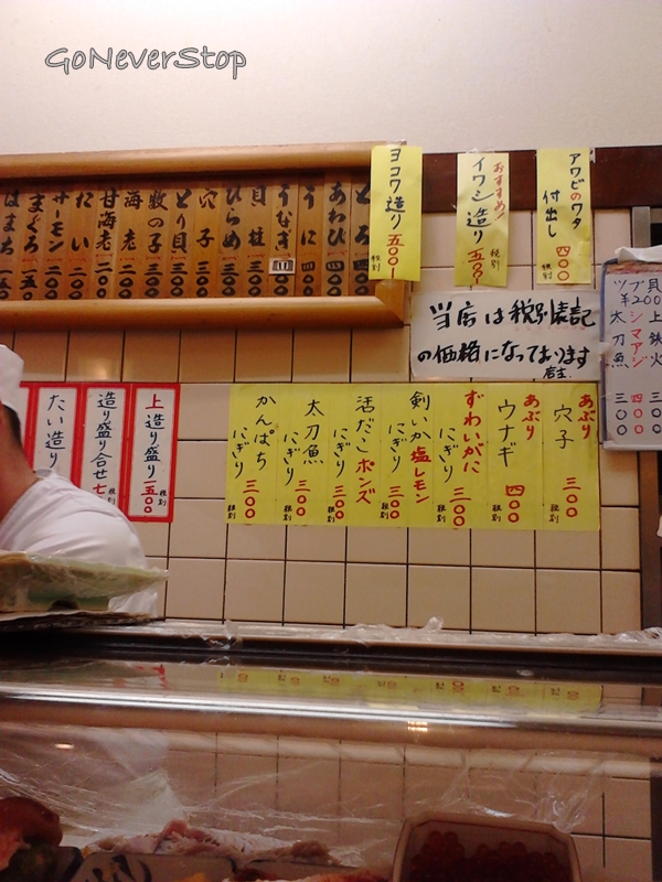 ซูชิไร้นาม จริง ๆ คืออ่านชื่อไม่ออก เห็นมีคนรออยู่พอสมควร มีรูปลงนิตยสารแปะการันตีอยู่ที่หน้าร้านด้วย ข้างในจะเป็นร้านเล็ก ๆ มีเคาท์เตอร์ให้นั่ง