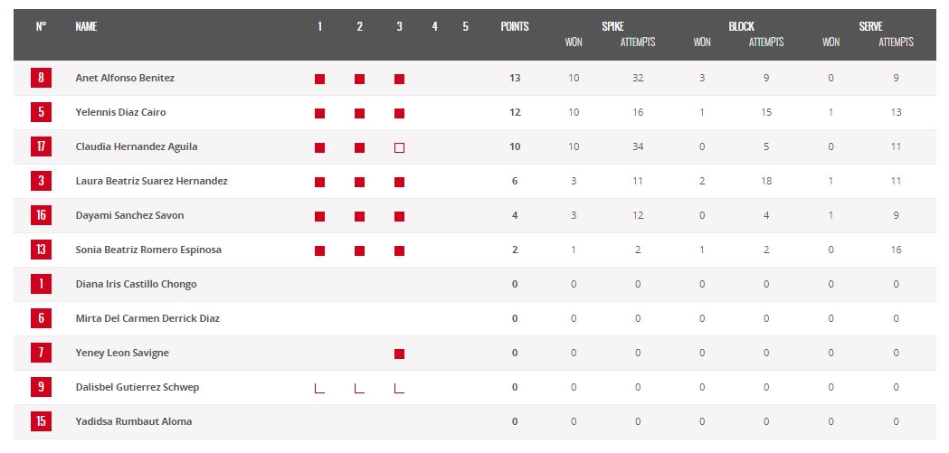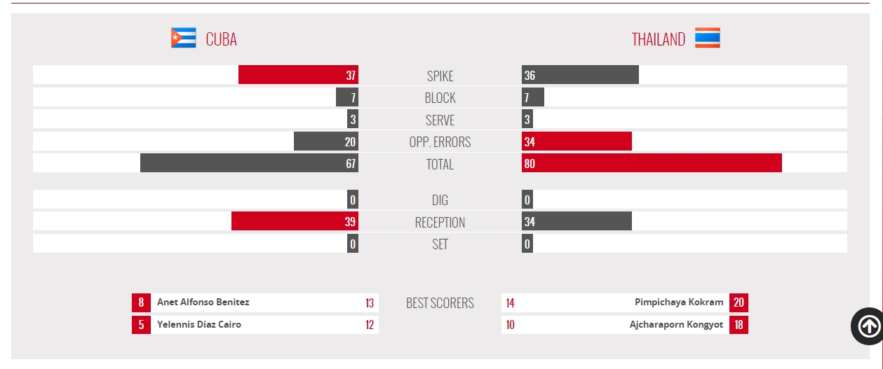 https://www.youtube.com/watch?v=HRiA3xj9S7o Cuba - Thailand : 2015 FIVB Volleyball Women's U23 World Championship 14 August 2015 Cuba 0 - 3 Thailand ( 17-25,28-30,22-25 )