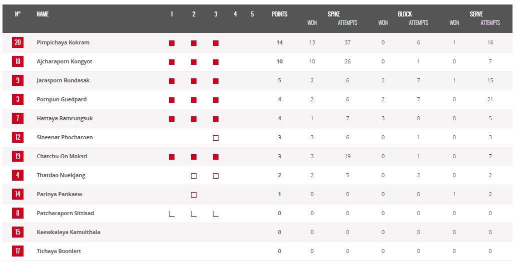 สถิติ วอลเลย์บอล U23 นัด1 ไทย-จีน