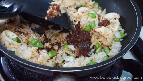 - สุดท้ายก็ใส่พระเอกของเราลงไปนั้นก็คือน้ำพริกนั้นเอง ต้าร์ใช้น้ำพริกของ เลอรส นะคะ เป็นประมาณน้ำพริกเผาที่มีแค๊ปหมูในนั้นด้วย รสชาติก็จะออกหวานเค็มกลมกล่อมแล้ว เครื่องปรุงอื่นเลยตัดทิ้งไปได้เลย