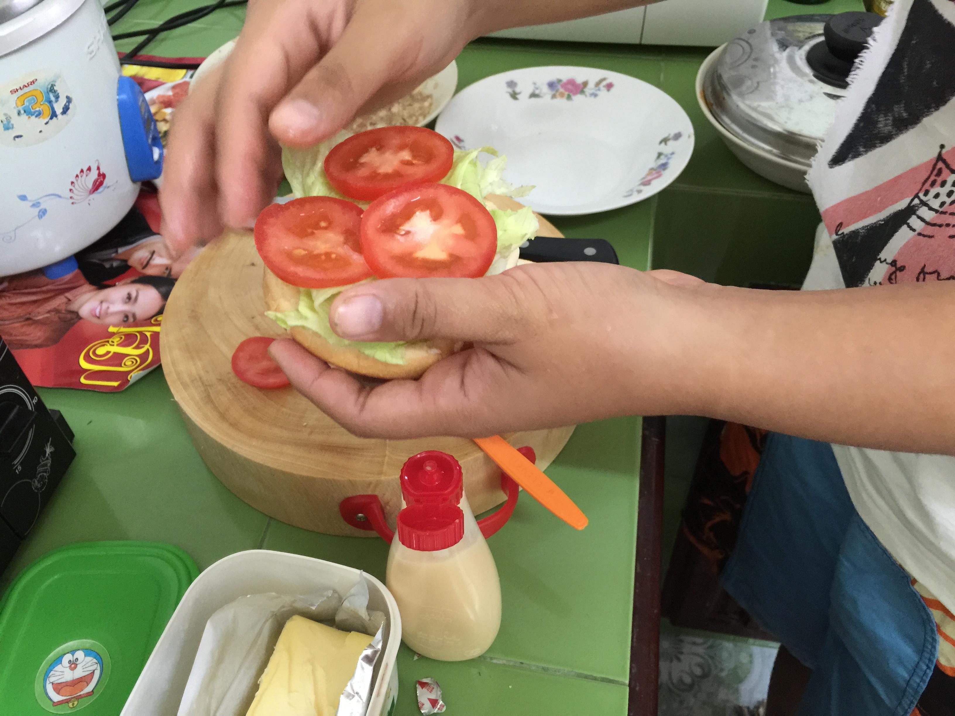 จัดผักไปอีกชุดหนึ่ง ใส่มัสตาสและมายองเนสทาใว้บนขนมปังด้วย