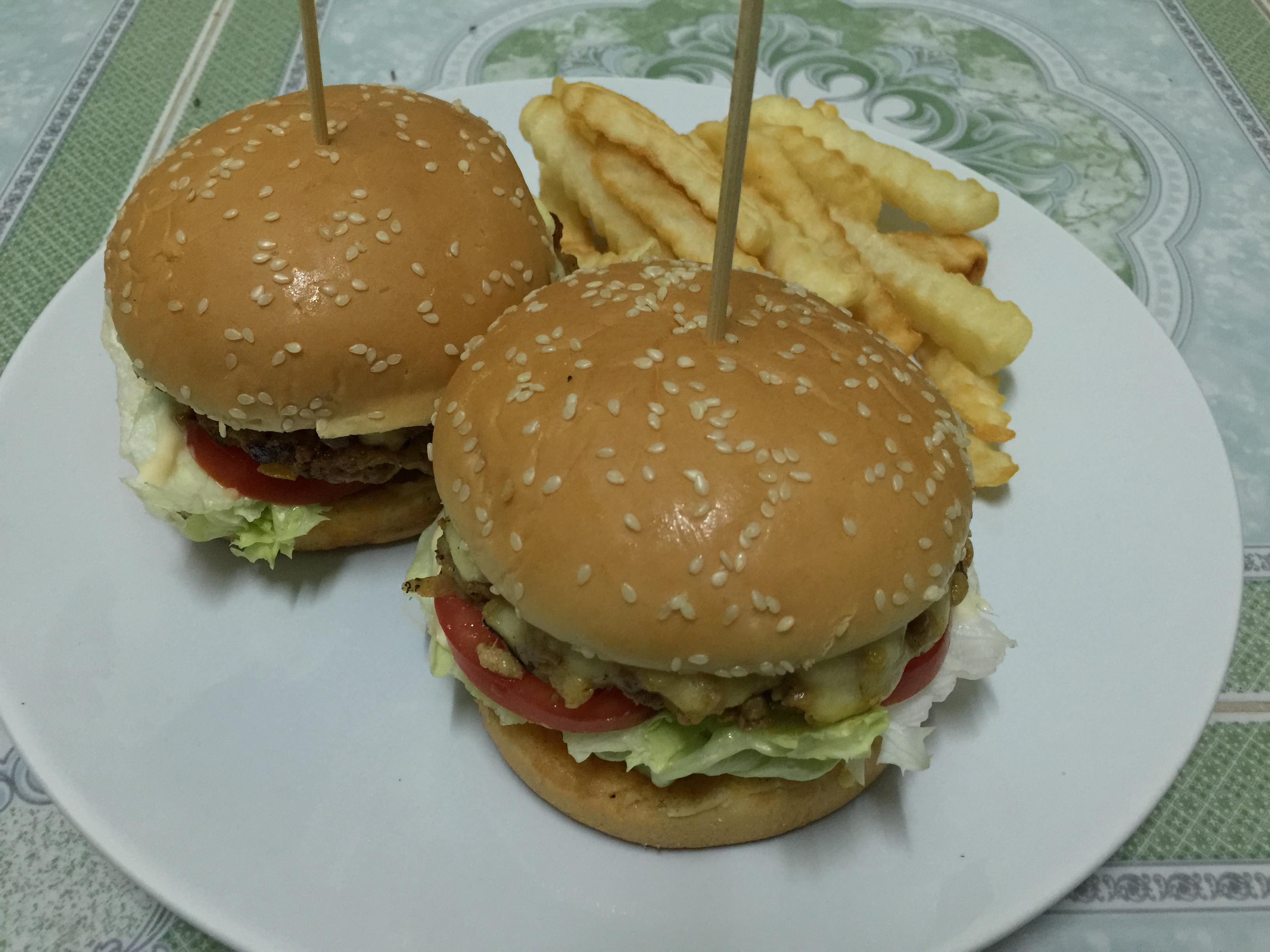 เย้!!! เสร็จแล้วเบอร์เกอร์แอบทอดมันฝรั่งเคียงนิดหน่อย โดนแฟนบ่นเลย แต่ก็หยิบกินไปบ่นไปนะ