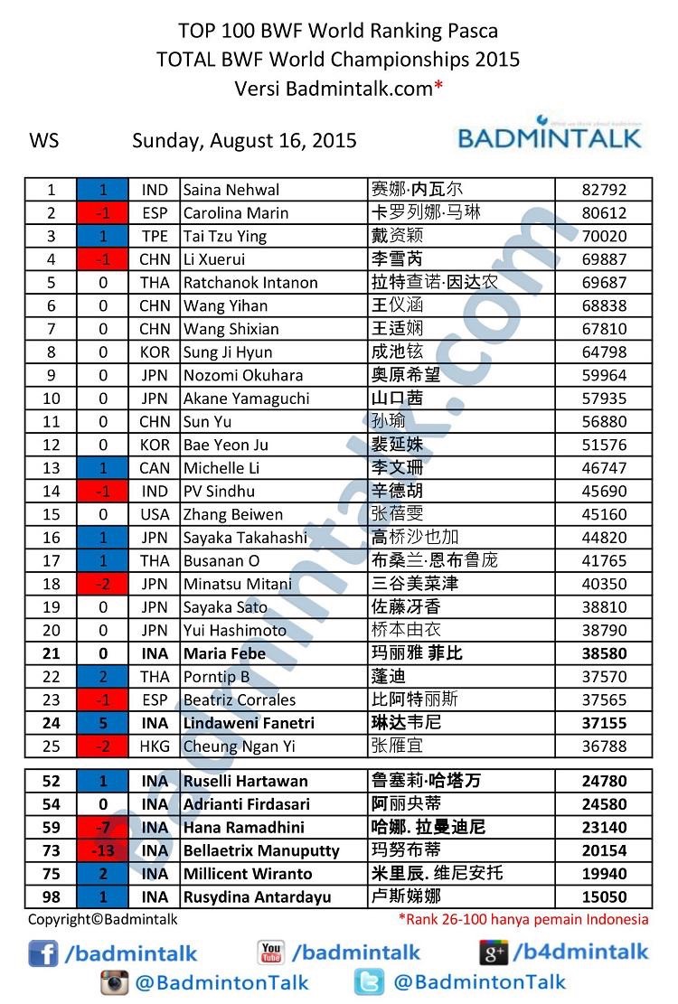 อันดับโลกหญิงเดี่ยวหลังจบ ศึกชิงแชมป์โลก