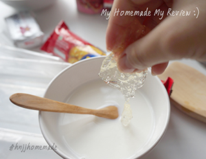 2. นำเจลาติน 2 แผ่นครึ่ง แช่น้ำให้อ่อนตัว เพื่อเวลาละลายในนมสดจะได้ไม่ต้องคนนานๆ และไม่ต้องคอยกังวลว่ามันละลายหรือยัง