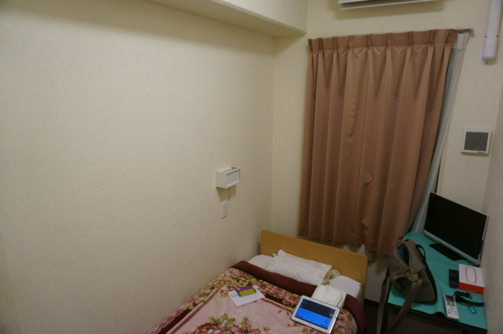 ที่ Palace Tokyo เป็นโรงแรมแบบห้องน้ำรวม แต่ดูยังใหม่อยู่เลย ห้องนอนก็ยิ่งเล็กลงไปอีก เพราะตัดห้องน้ำออกไป