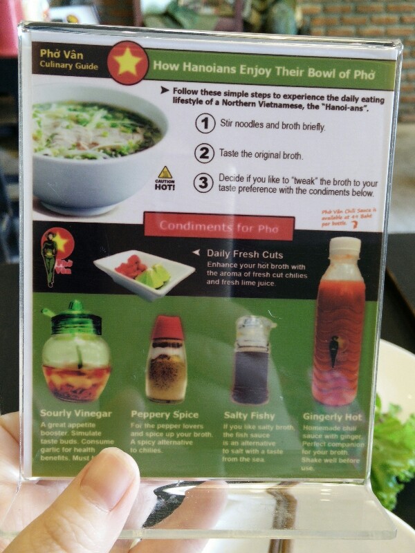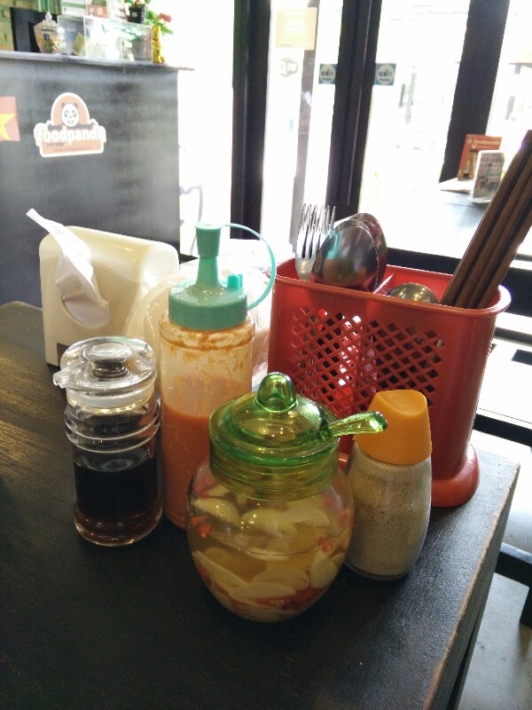 บนโต๊ะจะมีเครื่องปรุงต่างๆ มีน้ำปลา พริกไท น้ำส้มที่มีกระเทียมกับพริกดอง และพริกเวียดนามสีส้มๆ แต่ไม่มีน้ำตาล