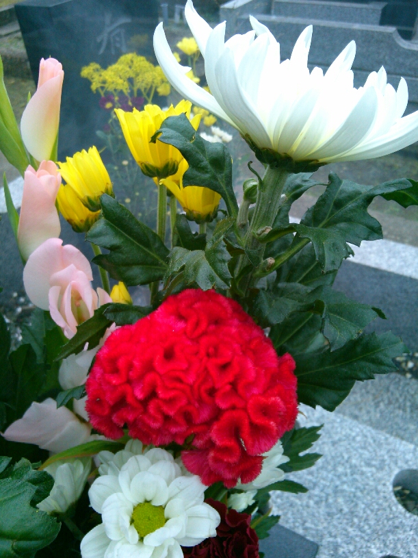 มักจะมีดอกเบญจมาศเป็นหลักแซมด้วยดอกไม้อื่นๆ สมัยก่อนตอน จขกท.มาอยู่ญี่ปุ่นใหม่ๆ เคยได้ยินเพื่อนฝรั่ง 2-3 คนเล่ากันว่าเพราะเห็นว่าสวยดี มีคนซื้อเยอะ เลยซื้อมาประดับบ้านบ้าง เอาไปเยี่ยมคนป่วยกันมั่ง พอมารู้ที่หลังเมื่อเห็นผู้รับสีหน้าไม่ดี ร้อง Oh no! กันจ๊ากเลย