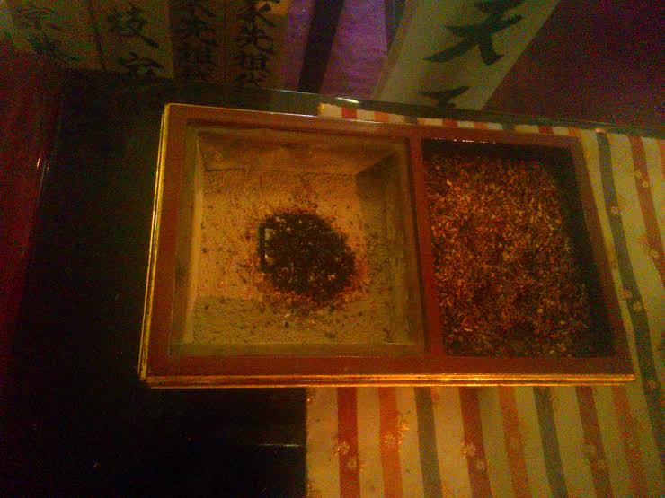 เราจะใช้นิ้วหยิบธูป ยกขึ้นมาระดับหน้าผากแล้วขยี้ๆเบาๆ เสร็จแล้วโรยลงไปบนไฟกรุ่นๆที่อยู่ในโถข้างๆ