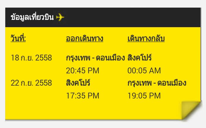 ผมจะเดินทาง ไป สิงคโปร์ เที่ยวบิน ที่ TZ-301 เครื่อง ออก 20:45 ถึง สิงคโปร์ เวลา 00:05 ของเช้า วันที่ 19 ก.ย.