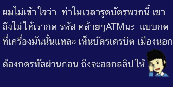 คือผมไป ซุปเปอร์มาเก็ตแล้วยื่นเดบิตจ่ายเงิน แล้วเค้าก็เอาไปเสียบ ( เสียบนะครับไม่ใช่รูด ) กับเครื่องแล้วมันขึ้นว่า ERROR แล้วเค้าก็พูดประมาณว่าบัตรผมชิปเสีย เอามือปัดชิปบัตรและเสียบใหม่อยู่หลายรอบเหมื
