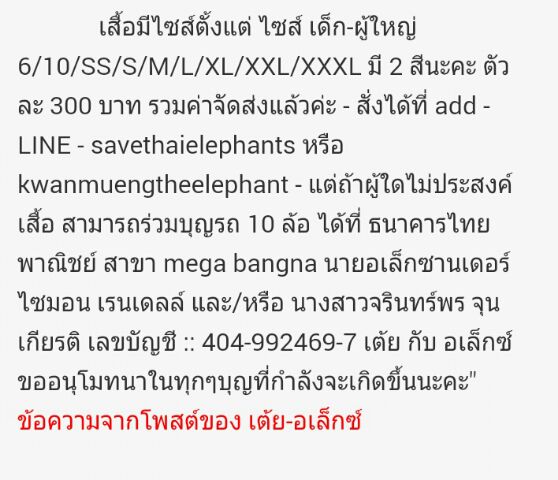 รายได้ทั้งหมด (ไม่หักค่าใช้จ่าย) จะนำไปซื้อรถสิบล้อเพื่อช่วยช้างค่ะ