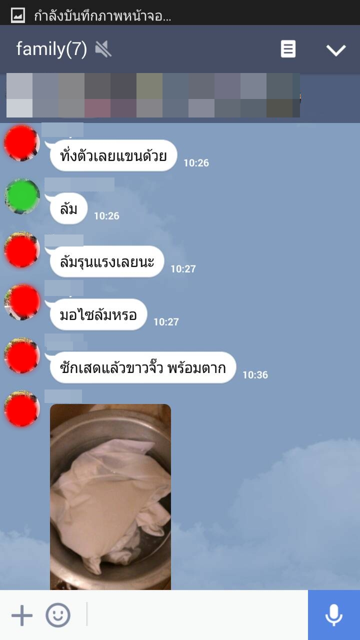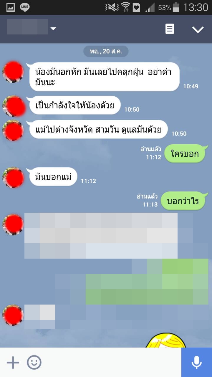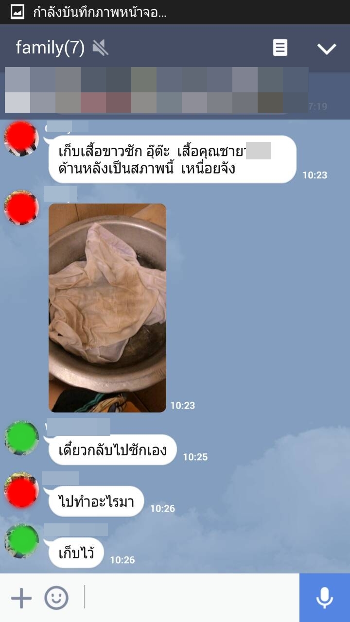 พอดีน้องชาย บอกแม่ว่าอกหัก เลิกกับแฟน แล้วมันไปรถล้มมา เสื้อเลอะเต็มตัว แม่เลยเอาไปซักให้ โดยมีบทสนทนาดังนี้