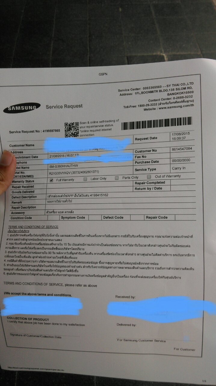 โดยผมไปสอบถามทางเจ้าหน้าที่ที่ศูนย์ก็อยากจะให้ผมเอาเครื่องกลับทั้งที่มันยังไม่เรียบร้อยเลย ผมเลยให้ออกใบส่งซ่อมใหม่ครับ ต่อมามีเจ้าหน้าที่โทรมาถามว่า เครื่องใช้ดีไหม ผมจะตอบได้ไงในเมื่อมันยังไม่เสร็จแล้วก็พยายามถามนะว่าเครื่องใช้ดีไหมปัญหาหายไหม ไม่เข้าใจว่าถามทำไมทั้งที่เครื่องยังไม่เสร็จ