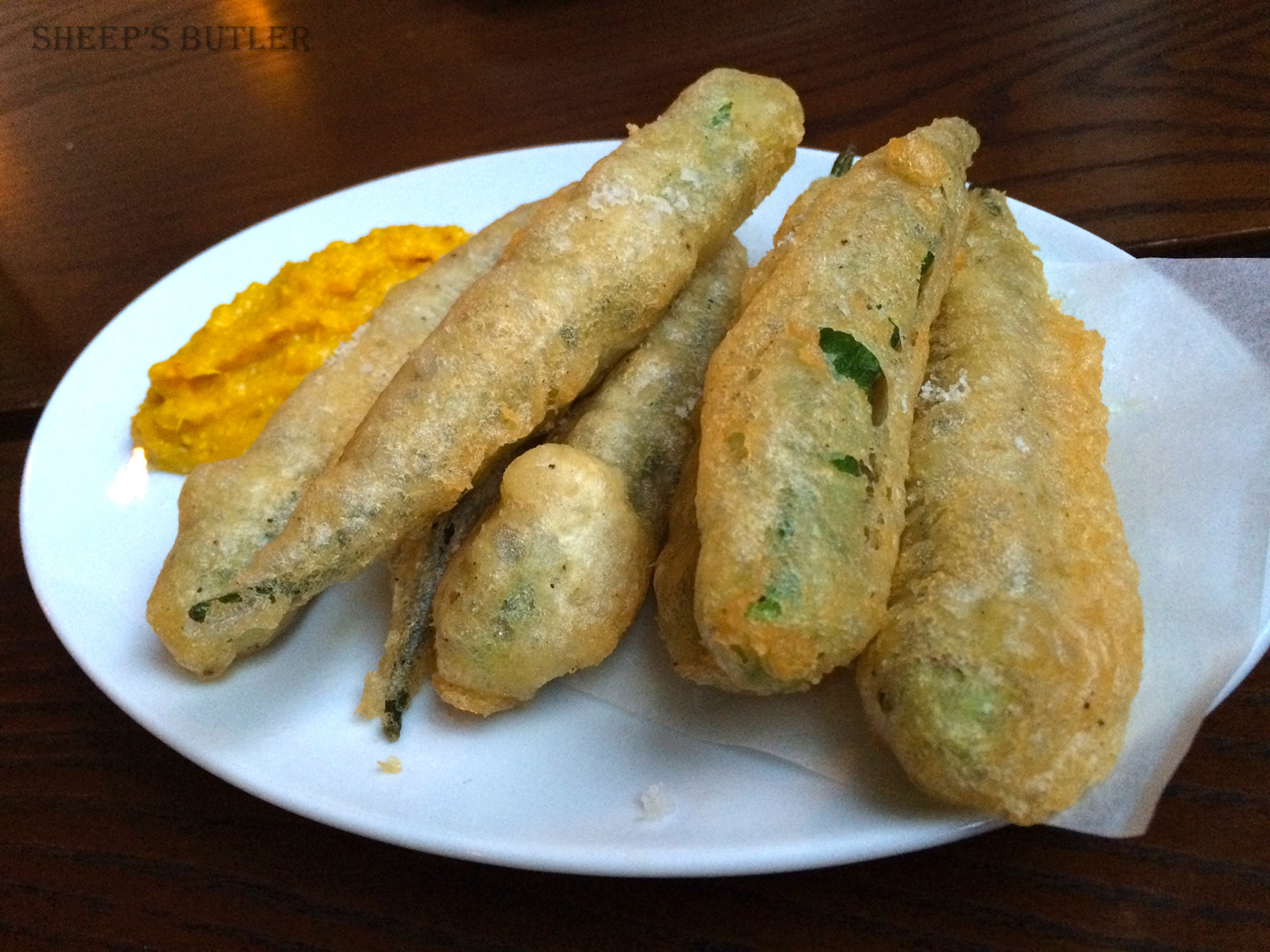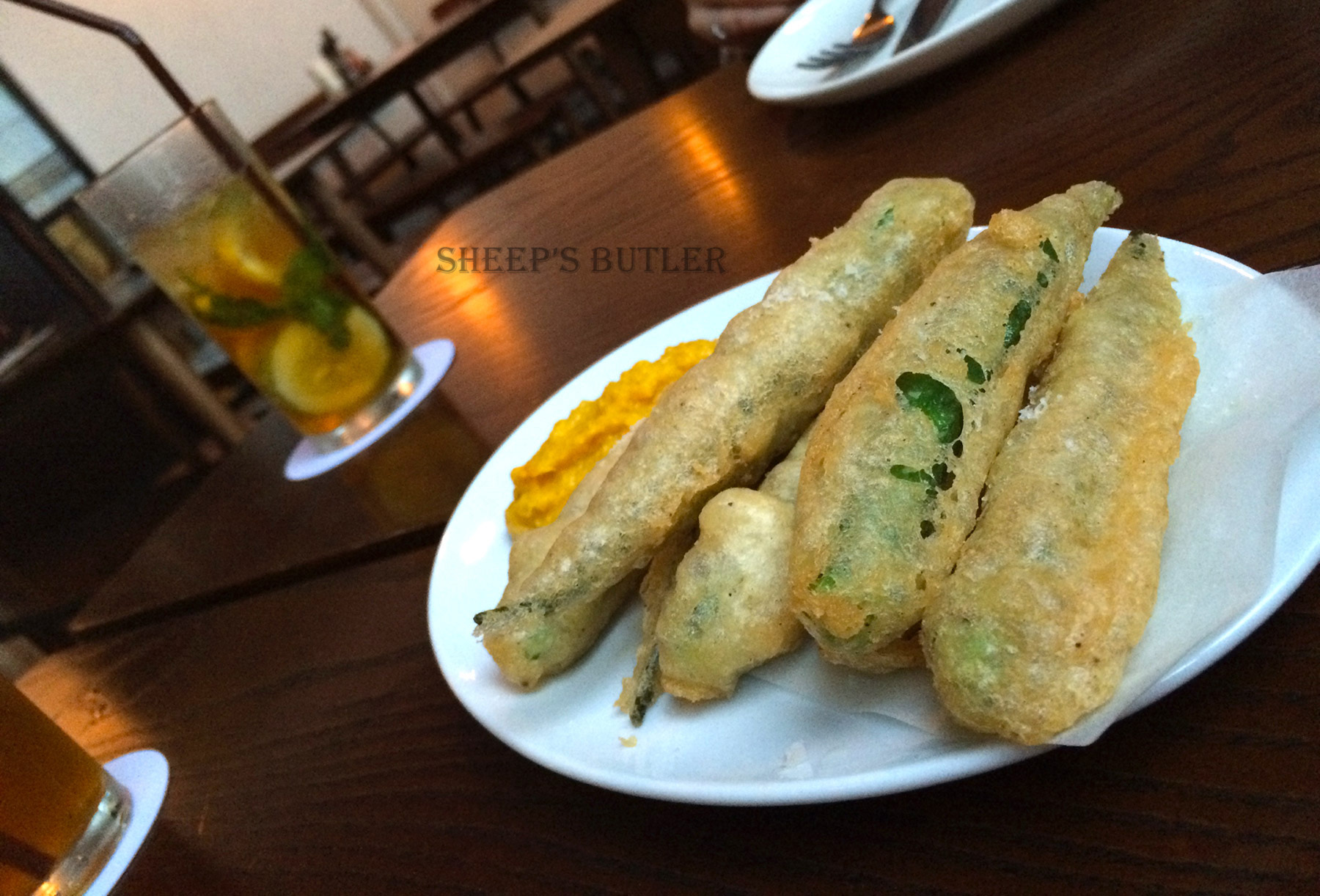 Crispy okra w pumkin aioli (180 B) – กระเจี๊ยบเขียวชุบแป้งทอดกรอบๆ เนื้อกระเจี๊ยบด้านในนิ่มๆ ทานคู่กับ pumkim aioli ที่มีกลิ่นหอมฟักทอง รสชาติเปรี้ยวๆหวานๆ อร่อยดีครับ