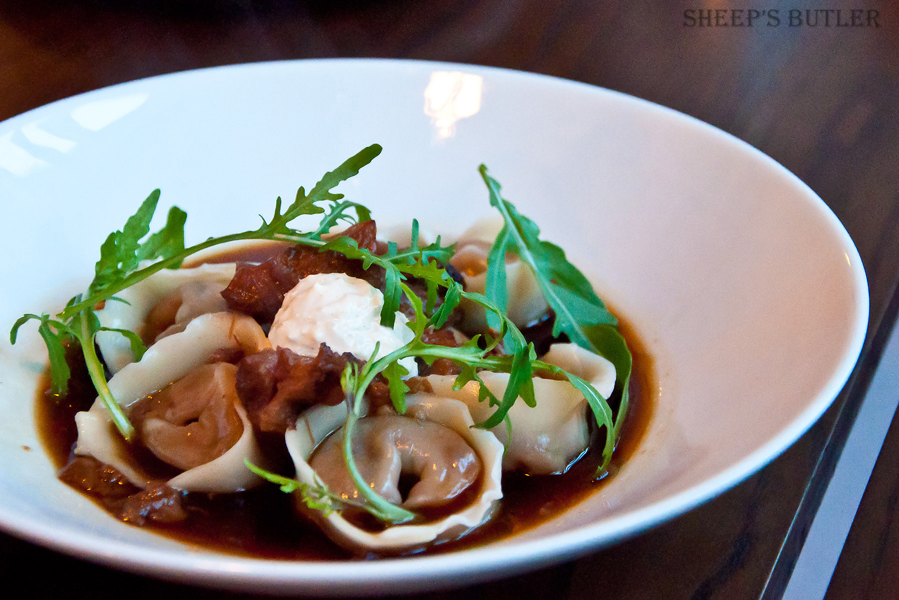 Bone marrow ravioli with wagyu corned beef & horseradish (450 B) – เมนูนี้ได้ความเป็นจีนผสมมาเต็มๆ ravioli ลวกมาสุกกำลังดี เสริฟพร้อมกับ เนื้อวากิวตุ๋นซีอิ๋ว เหมือนพะโล้ครับ แต่เนื้อนุ่มละลายได้เลย แปลกแต่อร่อยครับ