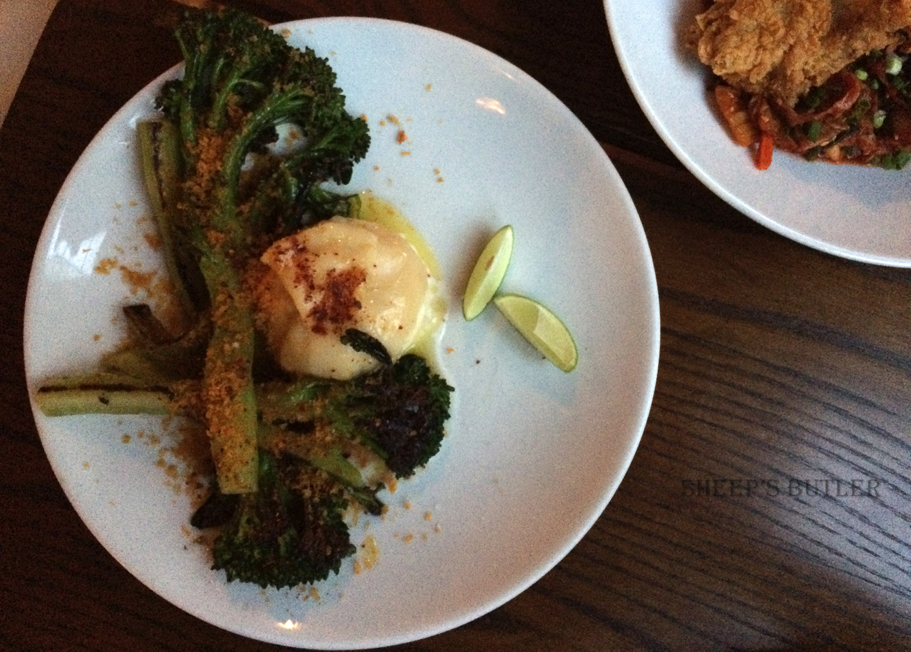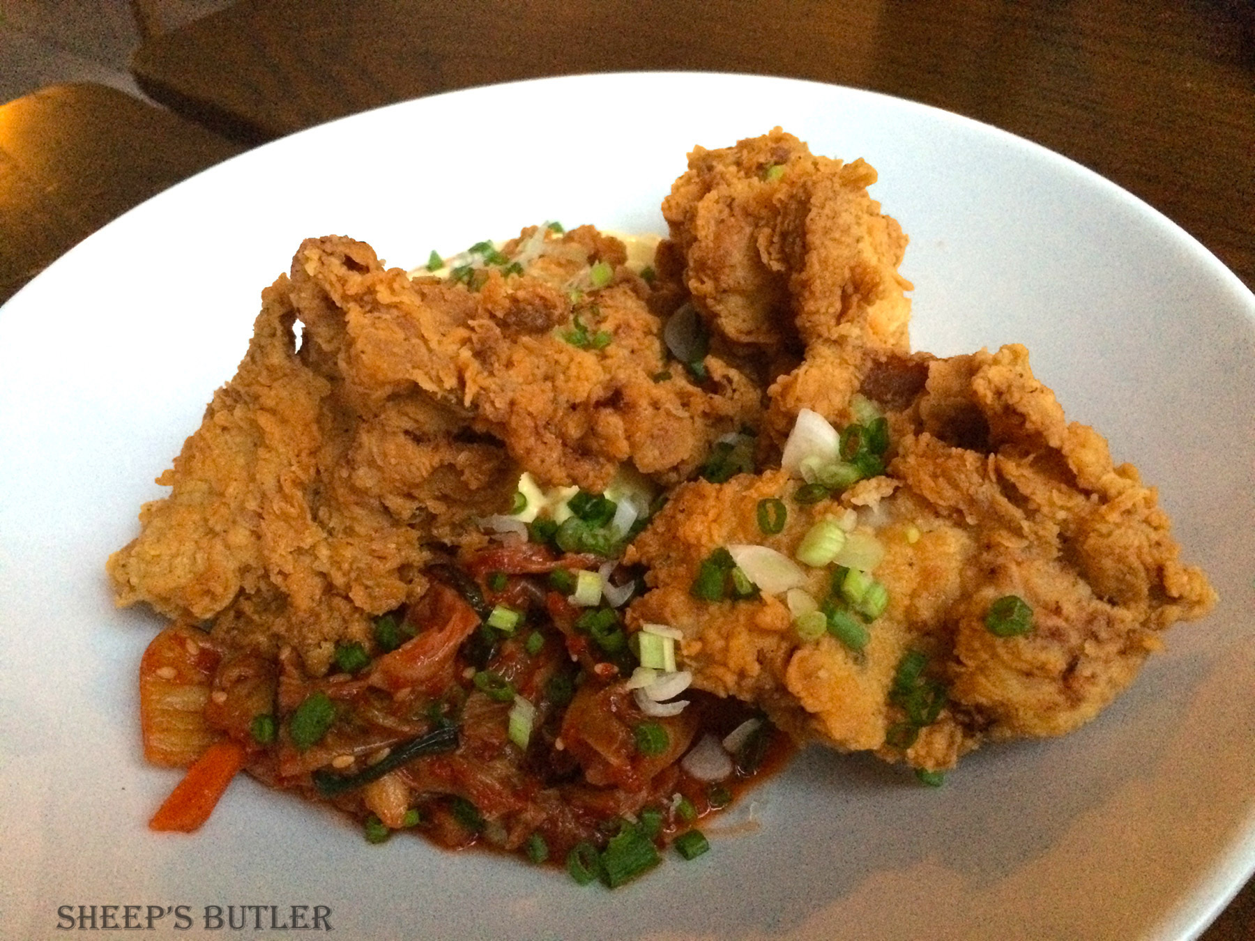 Buttermilk fried chicken, kimchi, spicy (! !) peanut & lime (360 B) – ไก่ทอดที่เหมือนจะธรรมดาแต่อร่อยมาก ข้างนอกกรอบแต่เนื้อด้านในยังชุ่มฉ่ำ วางอยู่บนกิมจิรสจัดจ้านและซอสถั่วรสออกเผ็ดๆเปรี้ยวๆครับ