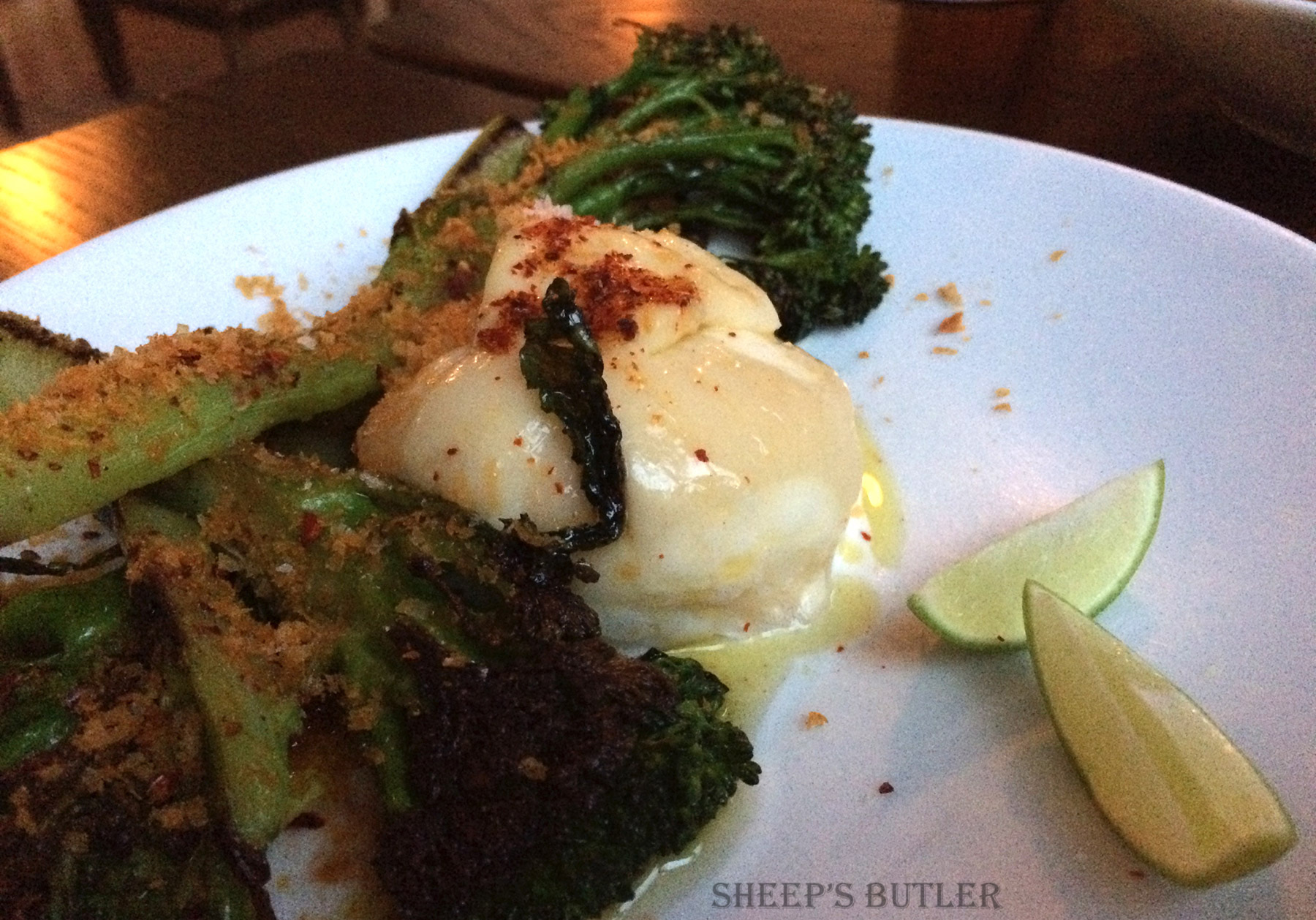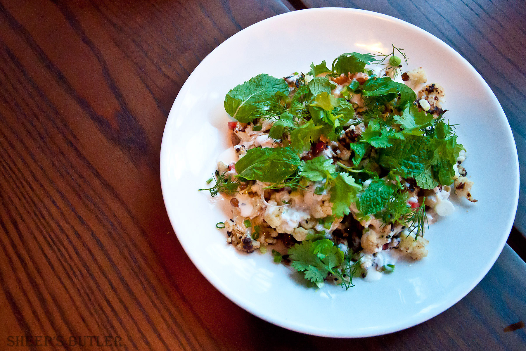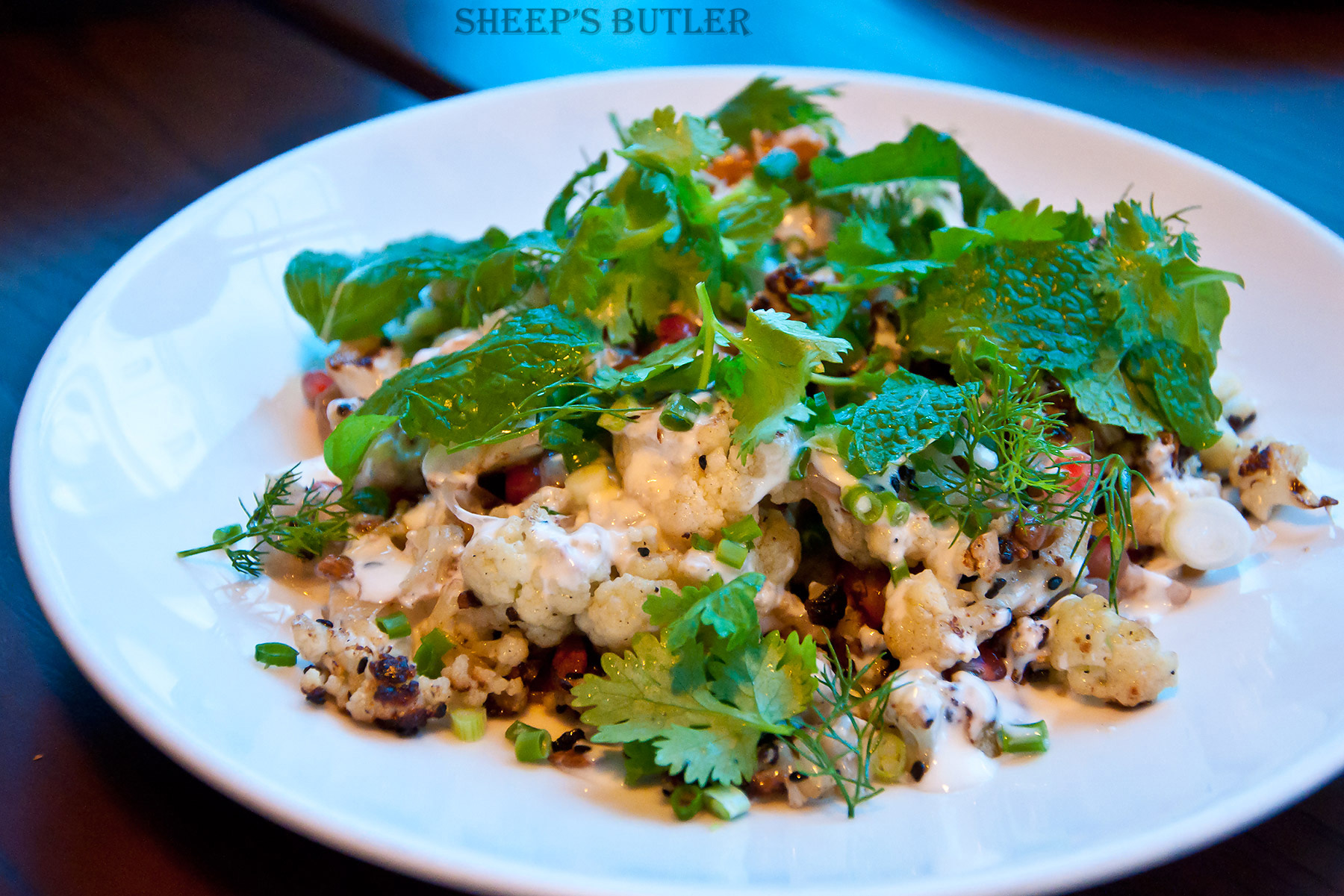 Brunt cauliflower, walnut, yoghurt, pomegranate (300 B) – สลัดจานนี้ยังคงมีกลิ่นอายของความเป็นจีนอยู่อีกเช่นกัน ตัวดอกกะหล่ำมีรสออกเค็มๆและกลิ่นหอมของกะทะเหมือนกับการผัดแบบจีนแล้วค่อยนำมาทำเป็นสลัด เติมความเป็นสากลด้วยวอลนัท โยเกิร์ตและทับทิม ได้ความอร่อยแบบลงตัว