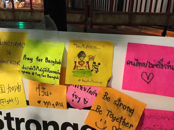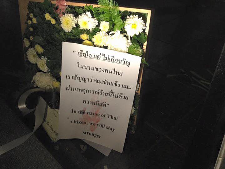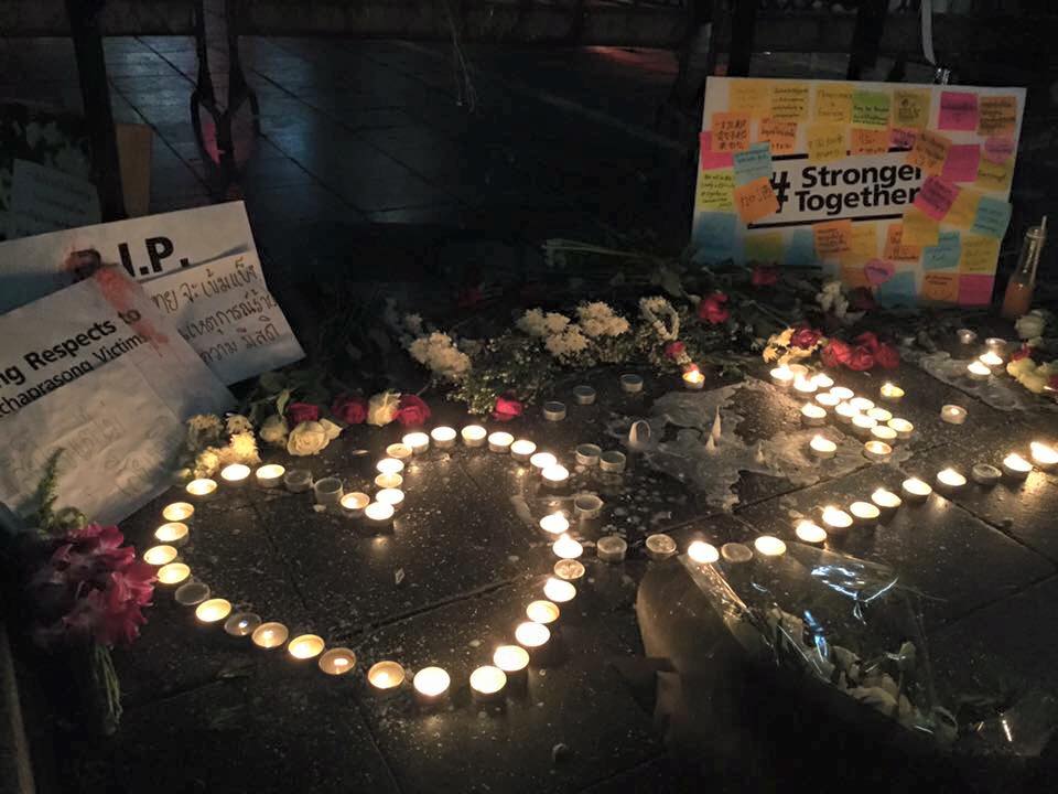 คนไทยและนักท่องเที่ยวชาวต่างชาติแห่จุดเทียน เขียนข้อความและนำดอกไม้ไปวางไว้บริเวณศาลท้าวมหาพรหมเอราวัณแยกราชประสงค์อาลัยผู้เสียชีวิตจากเหตุระเบิด