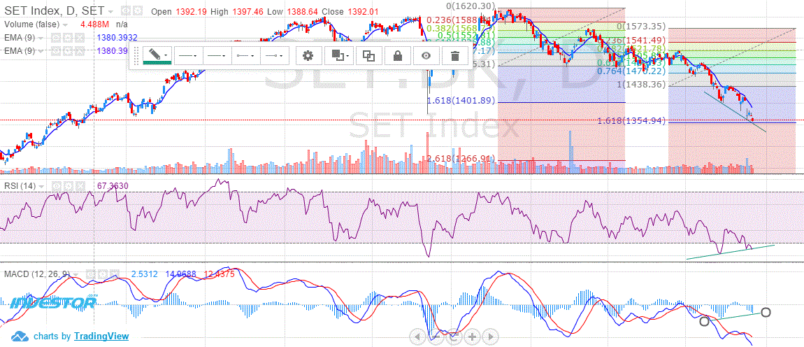 แต่ระยะ 161.8% ของขาลงตอนนั้น ถ้านำมาวัดต่อจากจุดยอดปลายเมษายนจะได้ราวๆ 1354 จุด และวันนี้เช้าตลาดทำจุดต่ำสุดที่ 1357.90 จุด