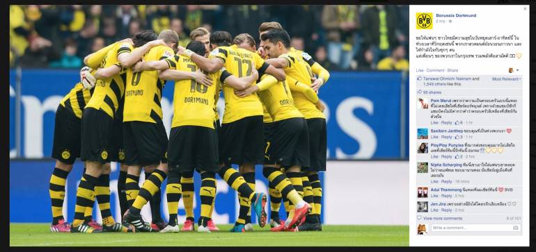 วันนี้ได้เห็นข่าวนี้ บอกตามตรงว่ารู้ประทับใจมากครับ สำหรับ สโมสร โบรุสเซีย ดอร์ทมุน ที่ร่วมให้กำลังใจแฟนบอลชาวไทยด้วยการส่งข้อความเป็นภาษาไทยผ่านหน้าเฟซบุ๊กแฟนเพจของสโมสร ดังข้อความต่อไปนี้