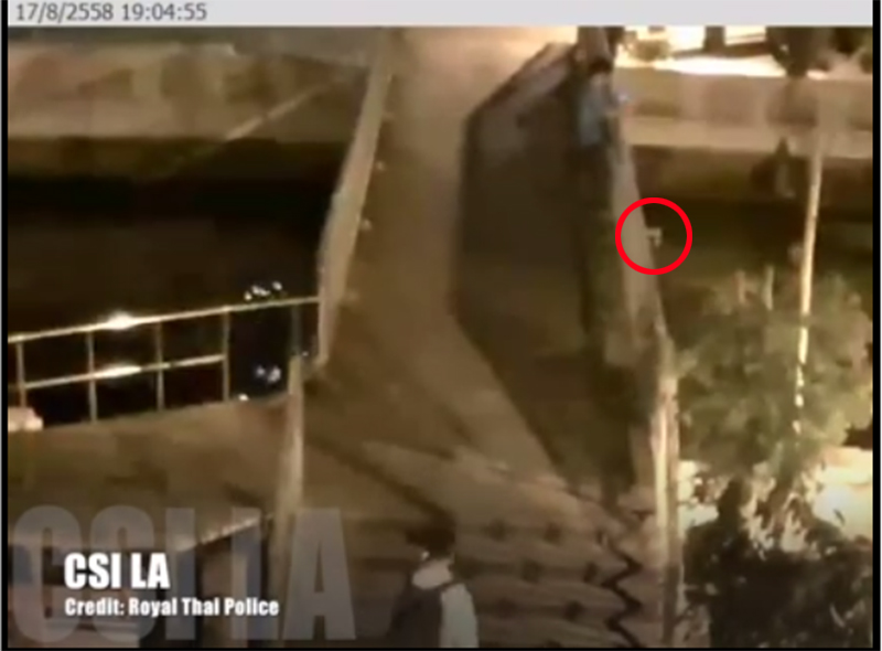 สังเกตชายเสื้อฟ้าเดินหิ้วถุงเข้ามาตั้งแต่ช่วงต้นคลิป ก่อนที่จะมาทำการถีบถุงที่หิ้วมาลงจากสะพานในช่วงท้ายคลิป โดยการให้เครดิต Royal Thai Police