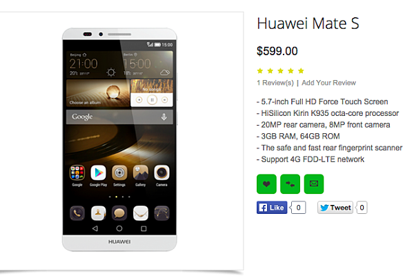 Huawei Mate S เผยโฉมอยู่บนเว็บไซต์ Oppomart ซึ่งเป็นเว็บค้าปลีกออนไลน์ชื่อดัง มีหน้าจอแสดงผลขนาด 5.7 นิ้ว Full HD และเป็นหน้าจอแบบ Force Touch ในขณะที่ยังไม่มีการประกาศเปิดตัวอย่างเป็นทางการจาก Huawei