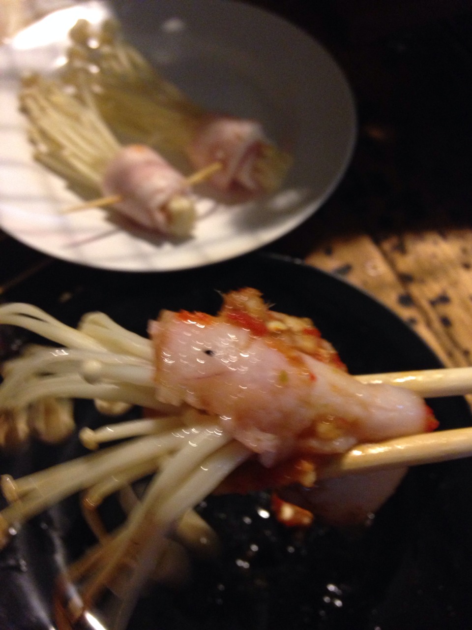 7.เพคอนพันเห็ดเข็ม เรียกว่า เด็ดเลยทีเดียว เบคอนจะหอมมากๆ ตอนย่าง เข้ากับเห็ดเข็ม ทานแล้วไม่เลี่ยนอย่างที่คิด จัดไปกว่า 20 ชิ้น