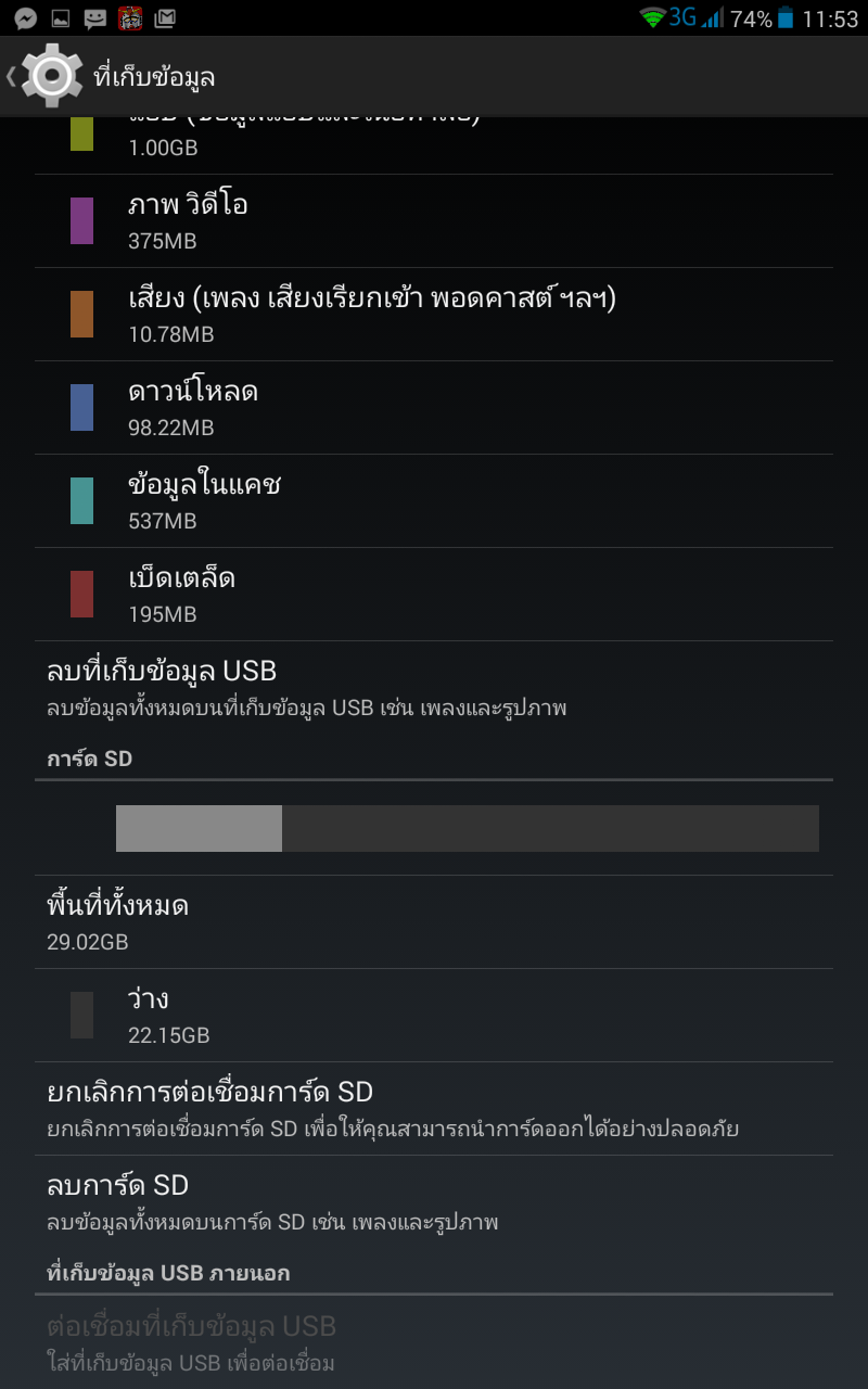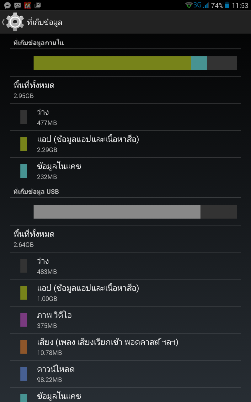 คือว่าได้ซื้อ True Smart Tab 7.0 มาใช้งานได้หลายเดือนแล้ว แต่พอดีไม่ค่อยมีเวลาเล่นอะไรมาก เมื่อวานนี้อยู่ๆเครื่องบอกพื้นที่เต็ม เลยไปเช็คพื้นที่ในเครื่อง ในสเปกบอกมีหน่วยเก็บข้อมูลภายในขนาด 8 GB แต่เช็คจริงทำไมมันมีแค่ 2.9 GB !!! แล้วมีหน่วยเก็บข้อมูลชื่อ "ที่เก็บข้อมูลUSB" แยกออกมาอีก 2.6GB มันคืออะไร???