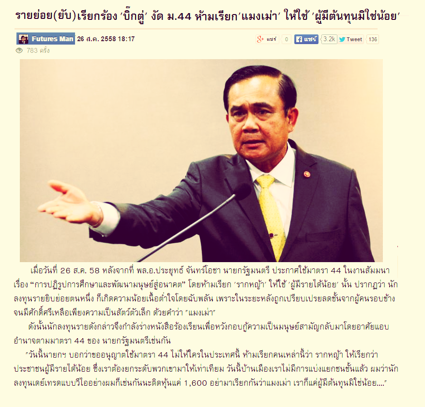 ชาวหุ้นเรียกร้องนายกฯใช้ ม.44 ห้ามเรียก แมงเม่า เหมือน รากหญ้า ค่ะ