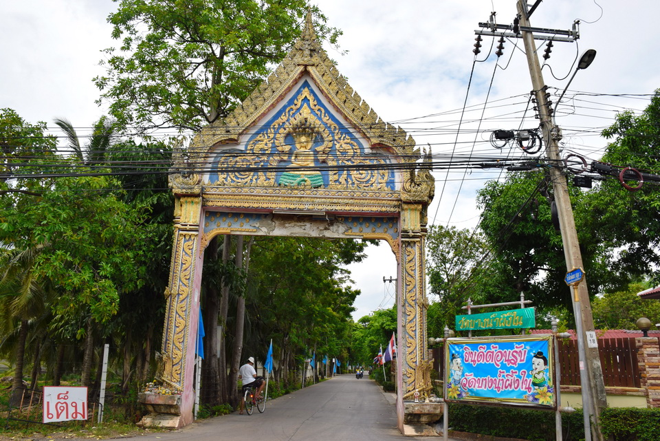 ปั่นออกจากซอยเพชรหึงษ์ 33 ไปเข้าซอย 26 แล้วปั่น ๆ ๆ ไปอีกเรื่อย ๆ จะเจอวัดบางน้ำผึ้งในอยู่ทางซ้าย อันนี้คือทางเข้าด้านหน้าวัดค่ะ (เราหยุดถ่ายรูปและเอาแก้วน้ำแตงโมปั่นไปทิ้งถังขยะ คือแบบปริมาณเยอะมาก ไม่สามารถกินหมดในซอยเดียวได้จริง ๆ)