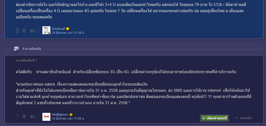 คือผมอยากใช้ซิมเดิม เบอร์เดิม แบบเติมเงิน แต่ อัพเป็น 4 G คือเพราะผมซื้อเครื่องใหม่มา เลยอยากลอง ถามในพันทิพ ทรูก็มาตอบว่าทำได้ ให้เตรียมบัตรประชาชนไป ทำได้เลย  ผมก็ไปรอคิวที่เซ็นทรัลแอร์พอร์ท เชียงใหม่ เข้าคิวอยู่นาน พอถึงคิวผม พนักงานก็ตอบว่าทำให้ไม่ได้ ถ้าจะทำต้องเปลี่ยนซิม คือต้องเปลี่ยนเบอร์ไปเลย ซึ่งผมไม่อยากได้เบอร์ใหม่ เพราะใช้เบอร์นี้มา 10 ปีแล้ว พนักงานก็เลยเสนอให้ทำแบบรายเดือน พูดข้อดีต่างๆ นาๆ ซึ่งผมไม่ต้องการ ก็เลยเดินออกมาแบบงงๆ  ผมไปที่ทรู เซ็นเฟส เชียงใหม่ต่อ  ด้วยความหวังว่า จะทำได้ แต่ได้รับคำตอบแบบเดียวกัน คือ จะให้เปลี่ยนเป็นรายเดือนให้ได้ ....ผมก็เลยหมดหวัง คือปัจจุบันผมมี 2 เบอร์อยู่แล้ว ทรูใช้โทร วันทูคอลใช้เล่นเน็ต ...แต่เห็นทรูมี 4 G และผมได้เครื่องใหม่จึงอยากลอง แต่ไม่อยากได้เบอร์เพิ่มไงครับ คือ ตกลง มันทำได้ หรือไม่ได้ครับ...อยากรู้ ผู้ชำนาญมาตอบหน่อยครับ ....(ปล. ด้วยความที่อยากทดสอบ 4 G มากๆ ก็เลยจำเป็นต้องไปซื้อซิม 4 G จาก 7-11 79 บาท เติมเงินอีก 300 เพื่อสมัครโปรเน็ต และก็ใช้ได้ สมใจ....แต่ ทำไมครับ ใช้เบอร์เดิมซิมเดิม แล้วอัพเป็น 4 G ไม่ได้ใช่ไหมครับ แล้วทำไมต้องเชียร์ให้เป็นรายเดือนครับ 4 G แบบเติมเงินก็เล่นได้ดี เร็วใช้ได้ ....ขอบคุณครับ)