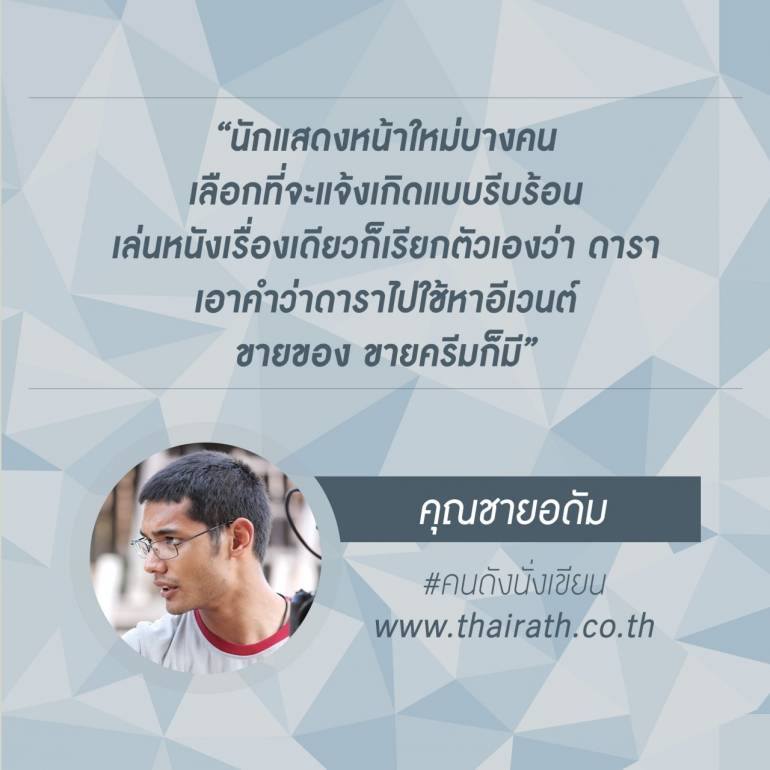 เราว่าคุณชายก็พูดถูกนะ ดาราบางคนก็เกาะกระแสจนเว่อร์ บางคนก็ไม้เห็นดังอะไรมากมาย คือเหมือนเข้าวงการมาเพื่อต่อยอดทางธุรกิจมากกว่า