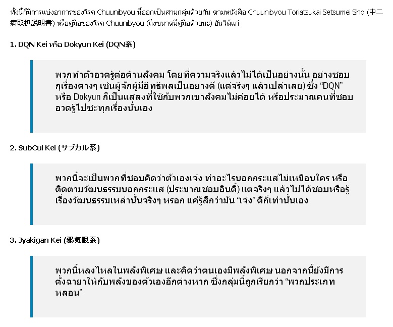ใคร ๆ ก็รู้ว่าจูนิเบียวคือโรคป่วยม.2 ที่บ้าอนิเมะมากจนจินตนาการว่าตนเองเป็นคนนั้นจริง ๆ แล้วเอาท่าทางมาใช้ในชีวิตประจำวัน แต่สิ่งที่ผมเจอคือมีคนเอาคำนี้ไปใช้กันหลากหลายเหลือเกิน ตัวอย่างเช่น -สมัยผมย